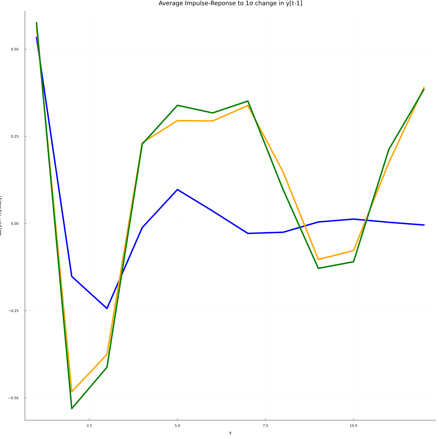 plot!(mean(iry, dims=2), leg=false, linewidth=5, title="Average Impulse-Reponse to 1σ change in y[t-1]",