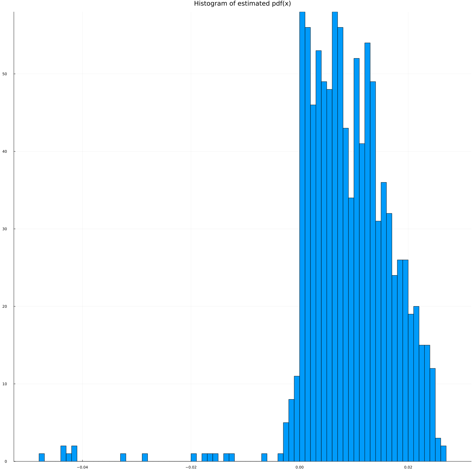 histogram(pdfx(x)', bins=100, leg=false, title="Histogram of estimated pdf(x)")