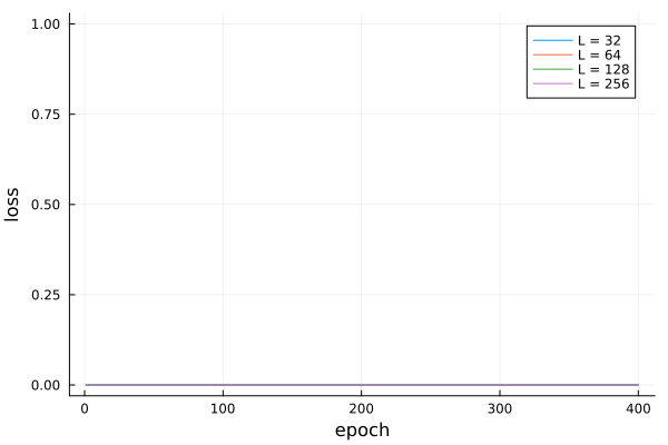 plot(1:epochs, lossvals', labels=reshape(["L = $l" for l in layersizes],1,length(layersizes)), xlab="epoch",ylab="loss")